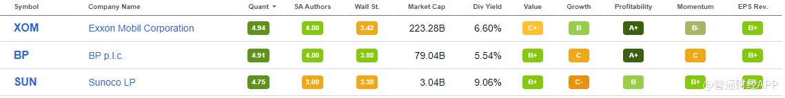 此外,分析师一直在上调这三只股票的每股收益预期,埃克森美孚、太阳石油和英国石油的每股收益修正评级均为B+。
