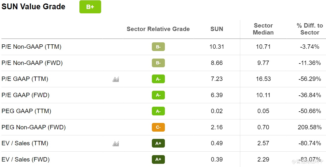 得益于强劲的市销率,以及9.1%的惊人股息收益率(几乎是能源行业中值的两倍),太阳石油的价值评级为B+。从传统的市盈率来看,该股也很有吸引力。