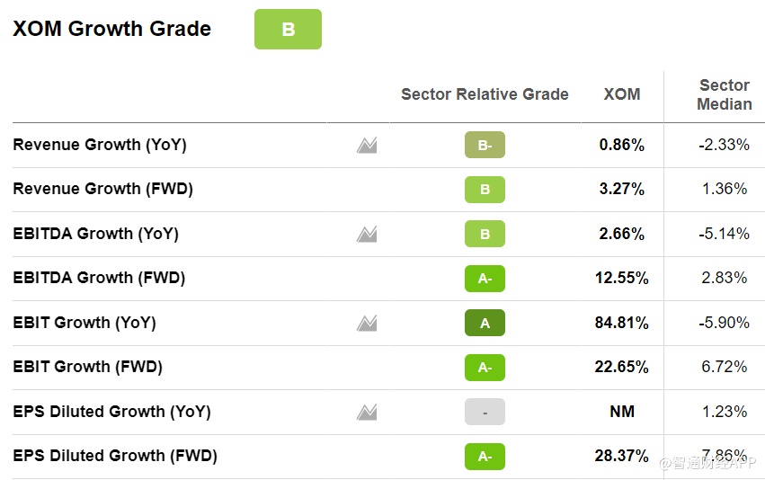 从潜在增长指标来看,太阳石油和英国石油与能源行业保持一致。然而,埃克森美孚在未来收入增长(B)、每股自由现金流增长率(A-)和未来息税前利润增长(A)方面具有相对优势。这些指标有望达到行业中值的两倍、三倍甚至四倍: