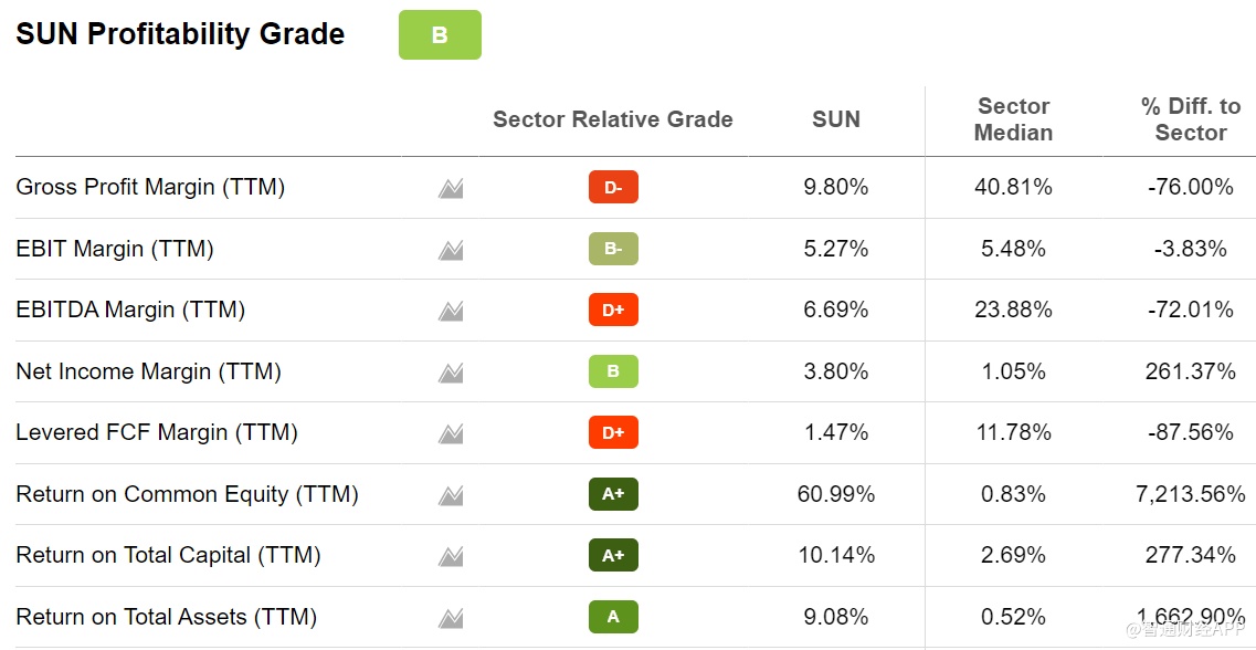 与此同时,太阳石油的回报率非常高,普通股回报率(TTM)和总资本回报率(TTM)评级均为A+: