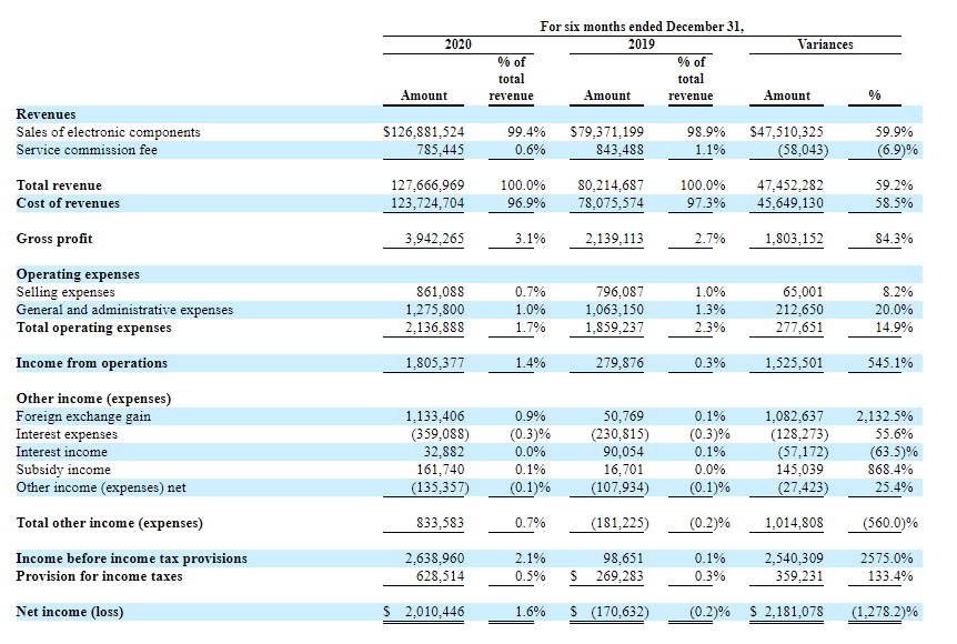 根据招股书上公布的未审计业绩显示,公司在2020年下半年营收约为1.28亿美元,2019年同期约为8021.47万美元,同比增长约59%。2020年下半年净利润约为201万美元,2019年同期净亏损约为17.06万美元。按营收划分,公司在2020年有99.4%的营收来自电子元件销售,0.6%的营收来自服务佣金。