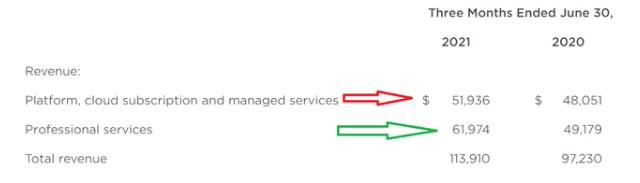 另一方面,第二季度最大的收入来源是专业服务。其专业服务同比增长26%(绿色箭头),而SaaS平台业务收入仅增长8%(红色箭头)。事实上,投资者对网络安全股票感兴趣是因为它们的经常性和粘性高收入,而不是因为咨询专业服务的低利润率和非经常性收入而感兴趣。