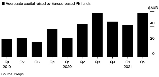 由于渴望收益率的投资者寻求在低利率环境下寻求更好的回报,私募股权公司正在筹集越来越多的现金。根据投资研究机构Preqin的数据,欧洲的私募股权基金去年筹集了1720亿美元,比2019年高出60%以上;今年迄今为止,它们筹集了大约1200亿美元,已经超过了2019年全年总额。