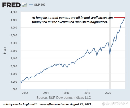 华尔街和美联储扩大了前所未有的债务融资投机泡沫 ,然后诱使散户“投资者”(即赌徒)加入,承诺巨额收益才刚刚开始,未来还有更多轻松赚钱的机会。然后华尔街逐渐出售其价格过高的垃圾股票,然后出乎所有人的意料(或并非如此),随着不可持续的泡沫破裂,市场突然崩溃。