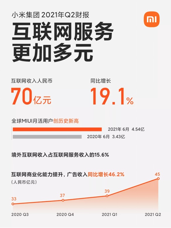 在集团“手机X AIoT”核心战略下,小米广告业务在Q1大增46.3%之后,Q2再次实现迅猛增长,增速达46.2%。从数据不难看出,技术赋能下的商业化能力已经成为小米互联网服务持续增长的关键推动力。