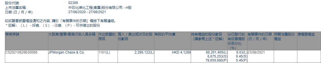 智通财经APP获悉,香港联交所最新资料显示,8月23日,小摩增持中石化炼化工程(02386)约229.61万股,每股作价4.1289港元,总金额约为948.04万港元。增持后最新持股数目约为8820.14万股,最新持股比例为6.03%。
