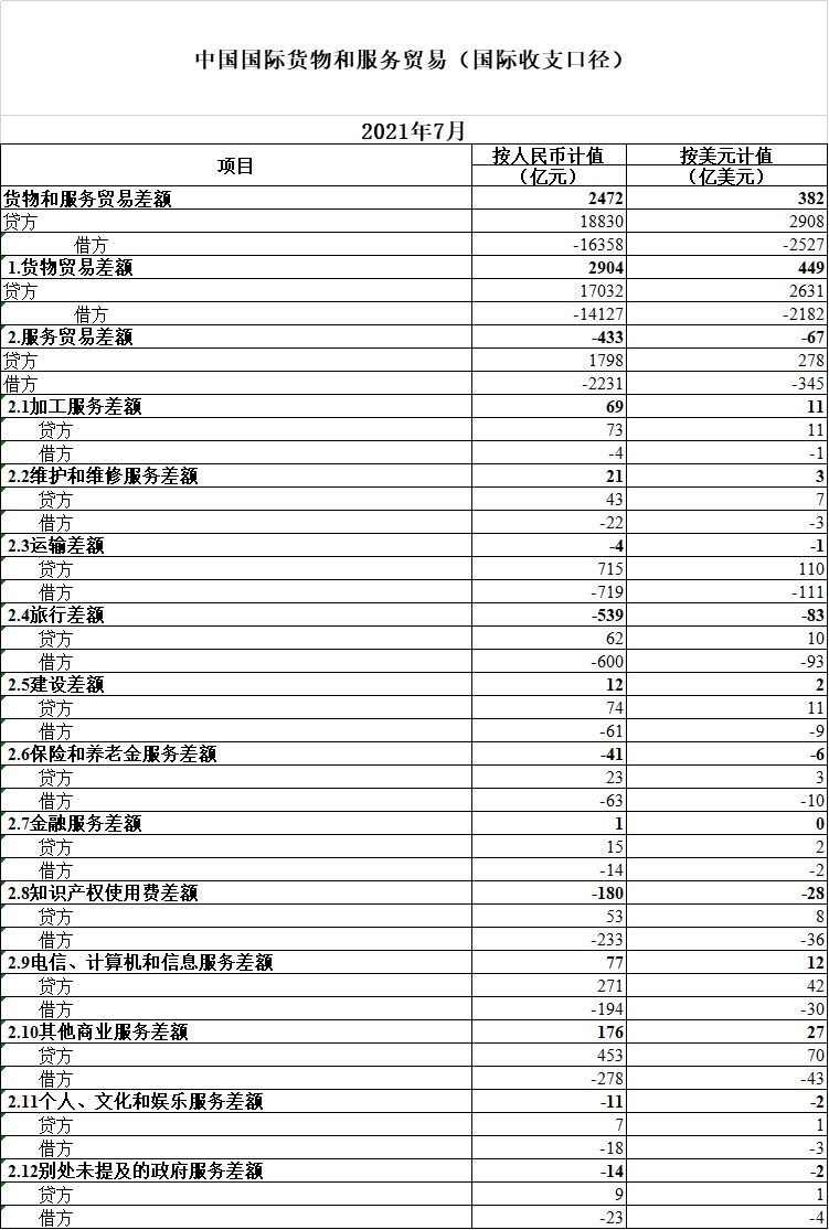 按美元计值,2021年7月,我国国际收支口径的国际货物和服务贸易收入2908亿美元,支出2527亿美元,顺差382亿美元。其中,货物贸易收入2631亿美元,支出2182亿美元,顺差449亿美元;服务贸易收入278亿美元,支出345亿美元,逆差67亿美元。