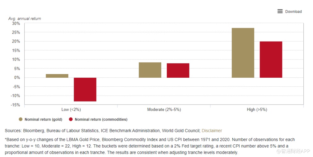 传统观点认为,大宗商品可以很好地对冲通胀。历史数据证实了这一点。在通胀时期,大宗商品总体表现良好。但黄金表现更好。