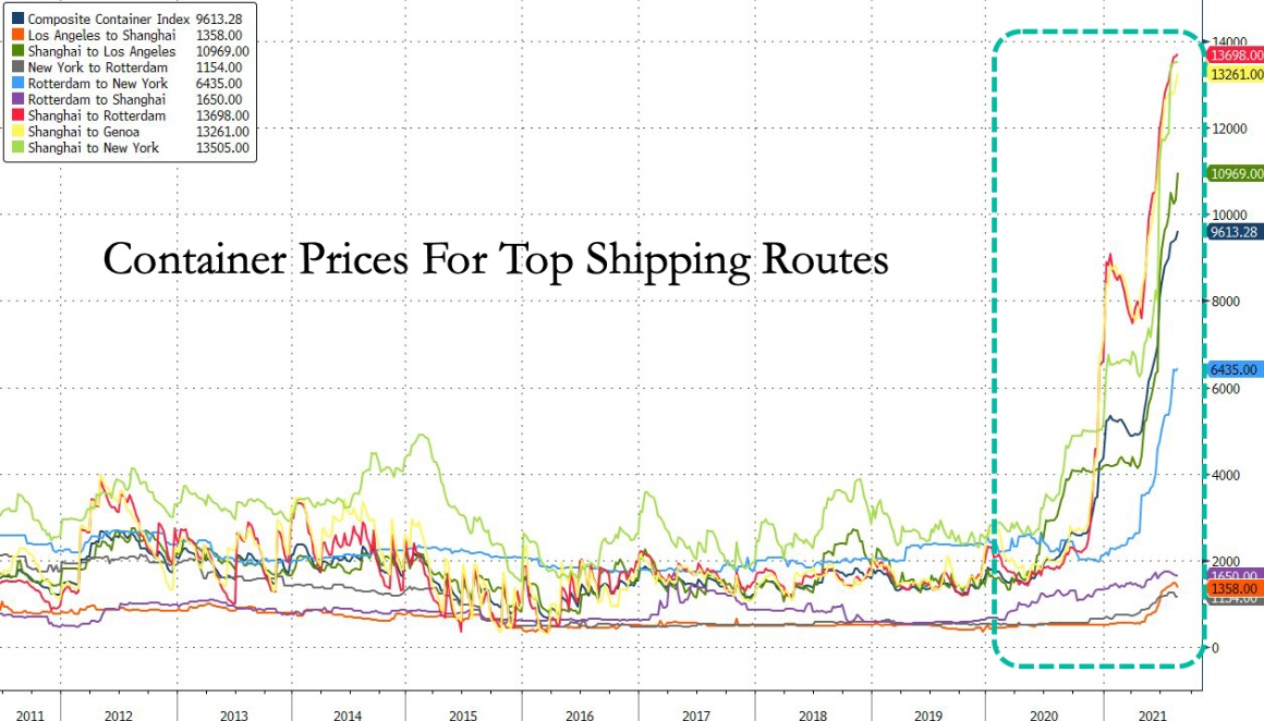 这样看起来,来自前线的最新消息是,供应链中断不会在短期内得到缓解,并将迫使消费者价格上涨。美联储所谓“通胀飙升只是暂时”的说法似乎难以符合实际了。