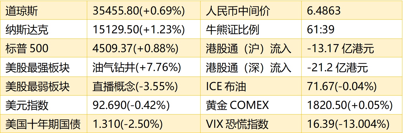 1、 上周五美股截至收盘,道指涨242.68点或0.69%,报35455.80点;纳指涨183.69点或1.23%,报15129.50点;标普500指数涨39.37点或0.88%,报4509.37点。道指上周累涨0.96%,纳指上周累涨2.82%,标普500指数上周累涨1.52%。港股ADR指数微跌,按比例计算,收报25378点,下跌28.71点或0.11%。