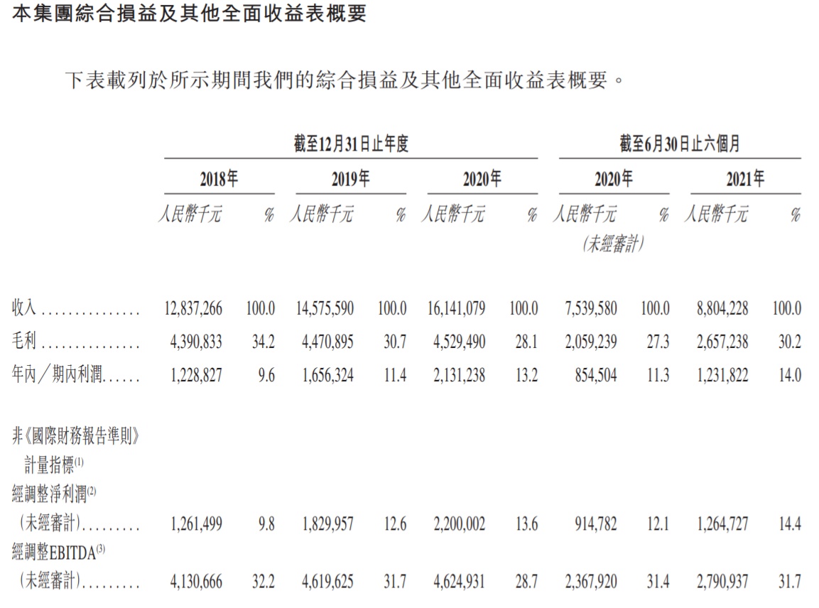 截至2018年、2019年及2020年12月31日止年度及截至2020年6月30日、2021年6月30日止六个月,公司收益分别约为128.37亿港元、145.76亿港元,161.41亿港元及75.4亿港元、88.04亿港元。同期毛利分别为43.91亿港元、44.71亿港元、45.3亿港元及20.6亿港元、26.57亿港元。同期经调整净利分别为12.61亿港元、18.3亿港元、22亿港元、及9.15亿港元、12.65亿港元。