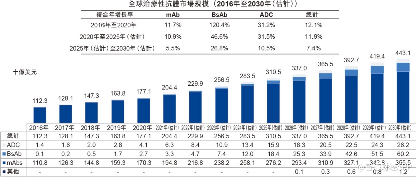 并且,由于医疗需求的上升及创新的抗体产品线,全球治疗性抗体市场预计于2025年达至3105亿美元,并于2030年进一步达致4431亿美元,复合年增长率分别为11.9%及7.4%。