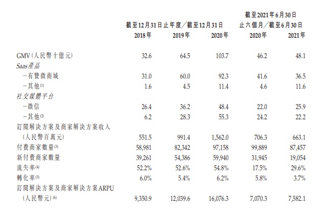 招股书显示,截至2018年、2019年、2020年12月31日及2021年6月30日止,有赞科技的收入分别为556.8百万元(单位:人民币,下同)、997.8百万元、1576百万元和669.4百万元。