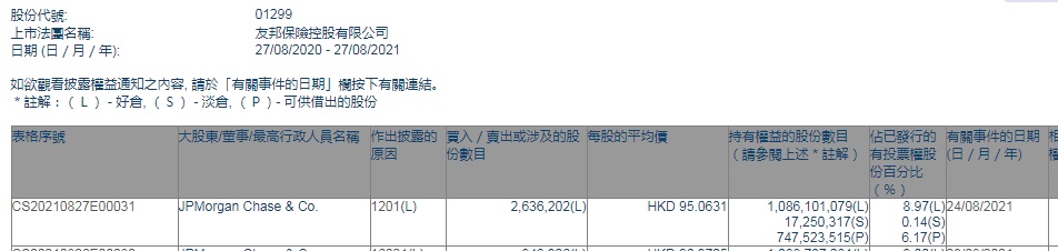 智通财经APP获悉,香港联交所最新资料显示,8月24日,小摩减持友邦保险(01299)263.6202万股,每股作价95.0631港元,总金额约为2.51亿港元。减持后最新持股数目约为10.86亿股,最新持股比例为8.97%。