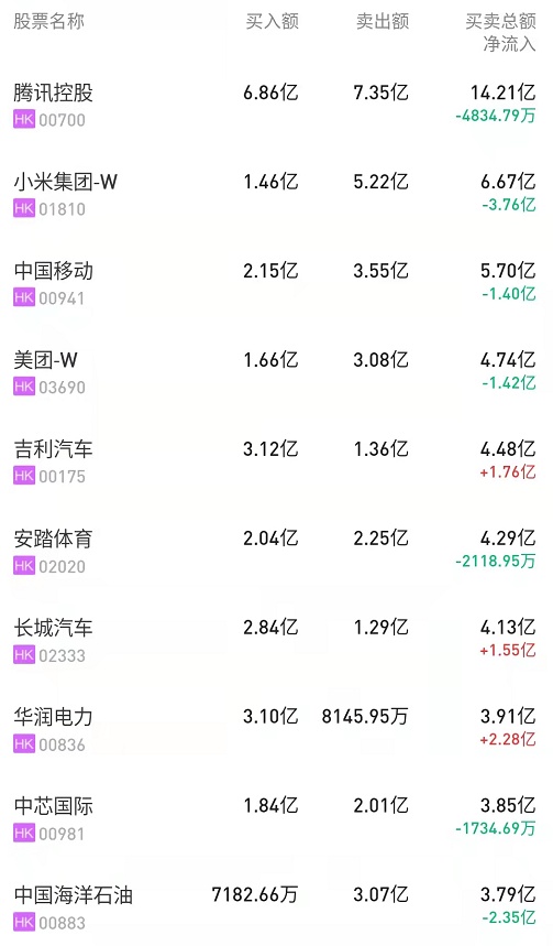 此外,中芯国际(00981)、中海油(00883)、中移动(00941)分别遭净卖出1.39亿、2.35亿、3.45亿港元。