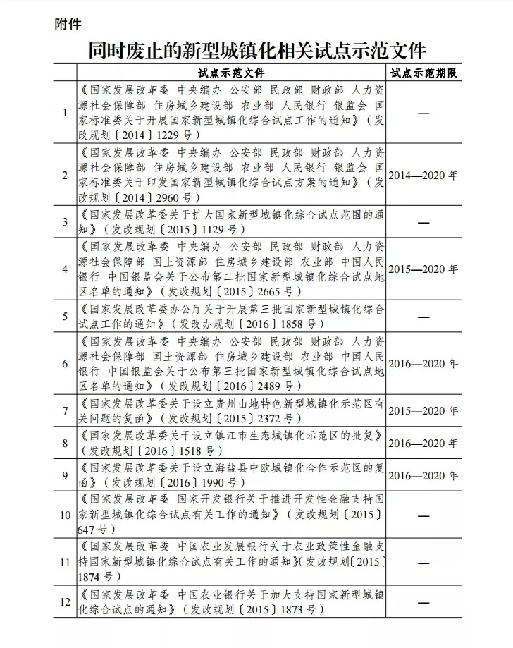 国家新型城镇化综合试点等试点示范已到期,试点示范工作到此结束,相关文件同时废止。同时,鼓励这些地区继续探索,围绕新型城镇化和城乡融合发展领域的重点难点问题,加强体制机制创新和政策突破,不断创造实践经验和改革成果。