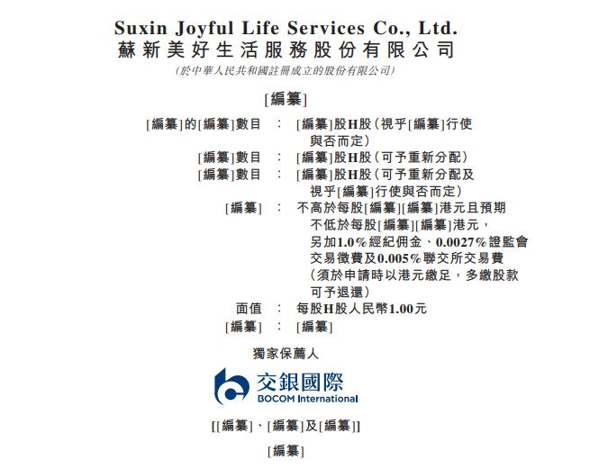 智通财经APP获悉,据港交所8月30日披露,苏新美好生活服务股份有限公司(Suxin Joyful Life Services Co., Ltd. )向港交所主板递交上市申请,交银国际为独家保荐人。