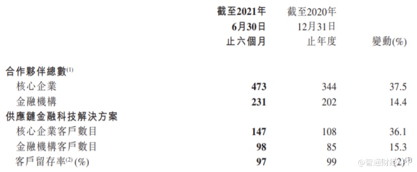 由于联易融在供应链金融科技解决方案领域有着丰富的经验和模块化技术,能够让客户以较低的成本享受到更高的价值和综合服务。因此,核心企业与联易融的合作黏性在不断增强,未出现任何一户核心企业出现停止合作的情况,随着客户持续加深对联易融产品的使用,公司保持了97%的高客户留存率。