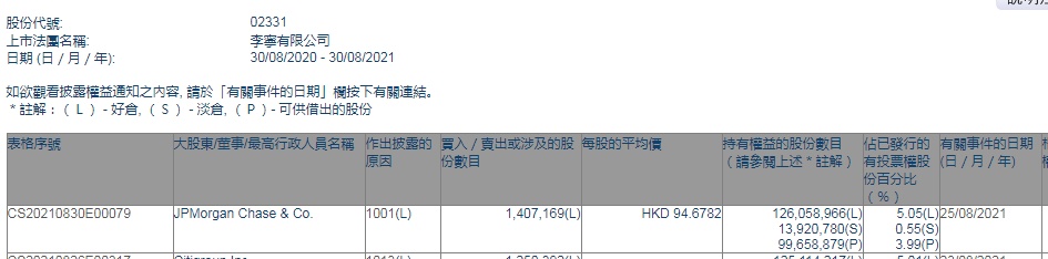 智通财经APP获悉,香港联交所最新资料显示,8月25日,小摩增持李宁(02331)140.7169万股,每股作价94.6782港元,总金额约为1.33亿港元。增持后最新持股数目约为1.26亿股,最新持股比例为5.05%。