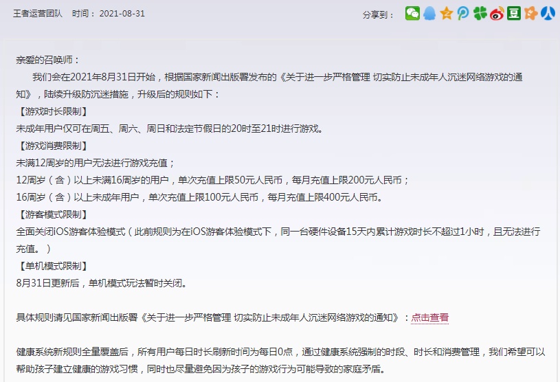 智通财经APP获悉,8月31日王者荣耀官方网站发布《防沉迷措施升级公告》称,即日开始,根据国家新闻出版署发布的《关于进一步严格管理 切实防止未成年人沉迷网络游戏的通知》,陆续升级防沉迷措施。升级后,未成年用户仅可在周五、周六、周日和法定节假日的20时至21时进行游戏。未满12周岁的用户无法进行游戏充值;12周岁(含)以上未满16周岁的用户,单次充值上限50元人民币,每月充值上限200元人民币;16周岁(含)以上未成年用户,单次充值上限100元人民币,每月充值上限400元人民币。