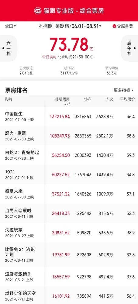 智通财经APP获悉,8月31日,据猫眼数据,截止至8月31日21时30分,暑期档(6月1日-8月31日)总票房73.78亿,观影人次2.04亿人,放映场次3117.9万场。档期票房前三名分别为《中国医生》、《怒火·重案 》和《白蛇2:青蛇劫起》。