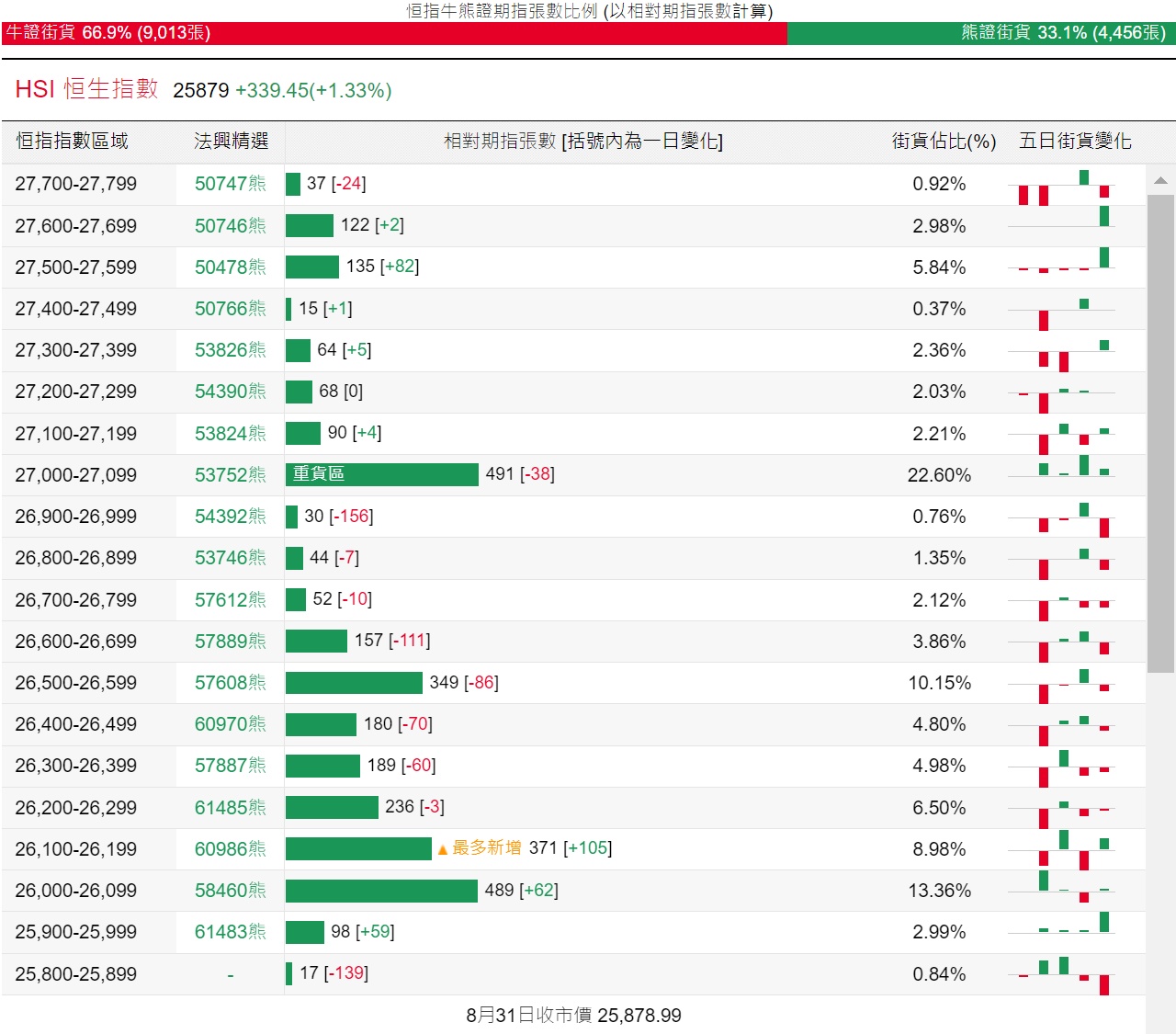 法兴恒指牛熊证街货分布图中的数据显示,熊证街货重货区在27,000-27,099区间,该区间最新熊证数量为491张,较上一交易日减少38张;最多新增在26,100-26,199区间,该区间最新熊证数量为371张,较上一交易日增加105张。