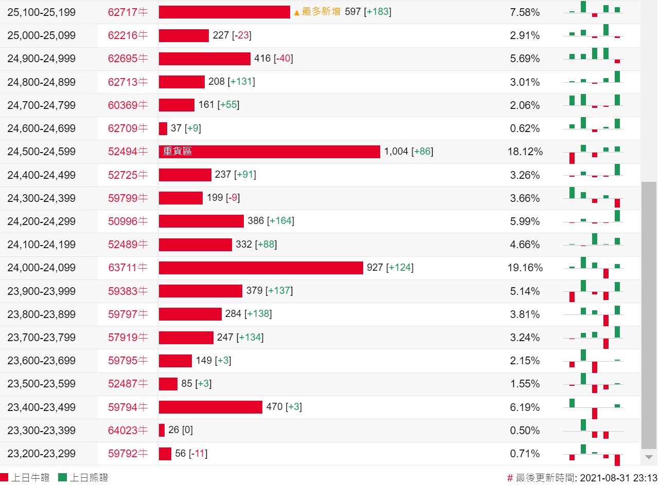 牛证街货重货区在24,500-25,599区间,该区间最新牛证数量为1004张,较上一交易日增加86张;最多新增在25,100-25,199区间,该区间最新牛证数量为597张,较上一交易日增加183张。