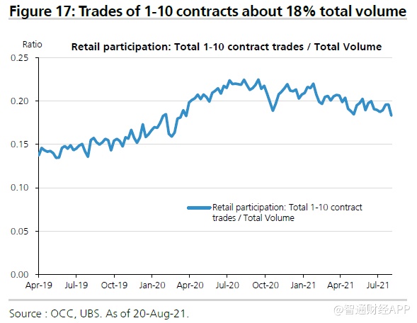 与此同时,过去一年推动市场狂热的一个关键源头目前已经平静下来。 根据瑞银的数据,小额期权交易(包括散户买入的1至10份合约)仅占总交易量的18.3%。 这是自2020年4月以来的最低水平。