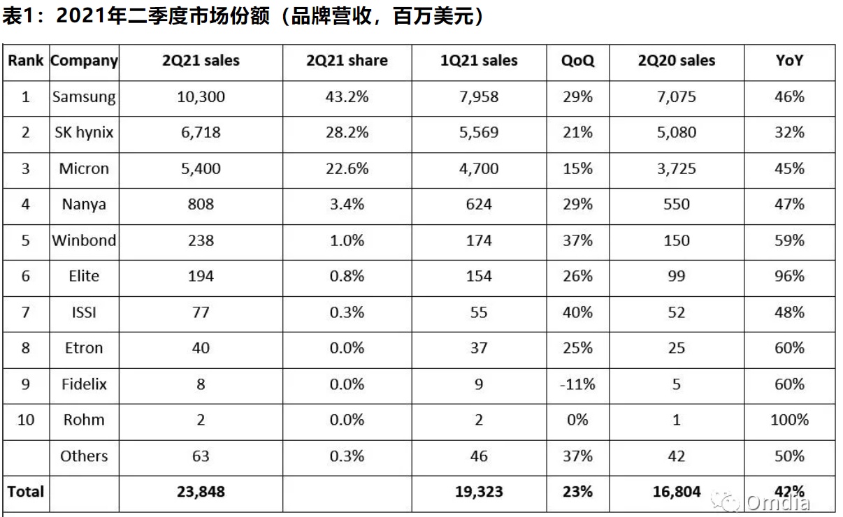 智通财经APP获悉,9月1日,Omdia发文表示,2021年二季度DRAM市场出货量处于高位,价格也有大幅提高。市场大多数应用领域的需求均十分强劲,这使得各家DRAM生产商仅凭及时供货,便实现了量和质的双重增长。2021年二季度DRAM市场的领跑者是三星电子,其市场份额达到了43%,由于在服务器混合扩展领域实现了出货量和价格这两方面的两位数提升,因此销售额季度同比增长了29%。SK海力士和镁光也因价格上涨而实现了销售额的显著季度同比增长,但这两家企业的季度同比市场份额实际均略有缩水,原因是出货量增长低于行业平均。