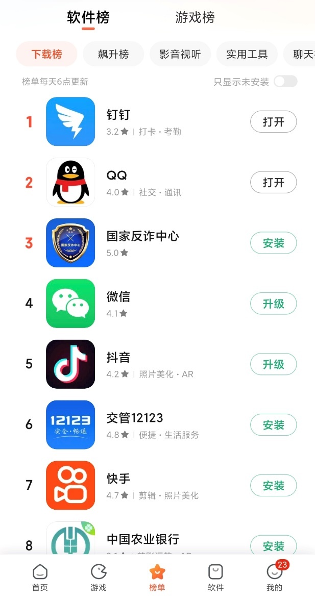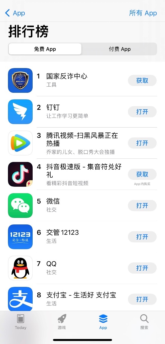 以苹果为例,免费APP排名第一的是国家反诈中心,第二为钉钉,其次是腾讯视频、抖音、微信等。