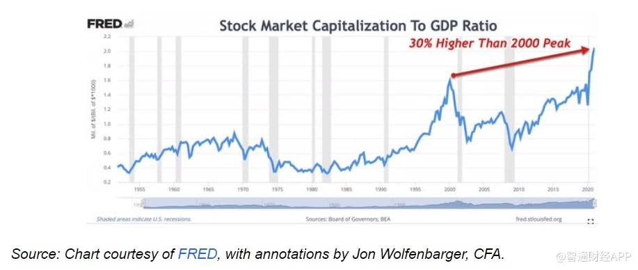 股市总市值与GDP之比是沃伦·巴菲特最喜欢的估值指标,同时也是最能准确预测未来股市长期回报的指标。基于这一衡量标准,当前股价比 2000 年科技泡沫的历史高点高出 30%!只有股市下跌超过60%,这一比率才能回到2009年3月股市触底时的水平。