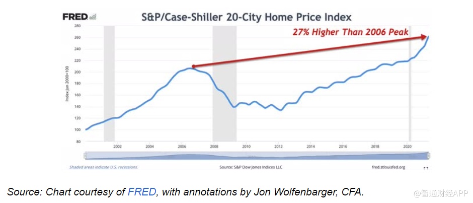 美国房地产也很昂贵,房地产投资信托基金的股息收益率处于历史低位。如下图所示,目前的房价比2006年房地产泡沫达到顶峰时高出27% !