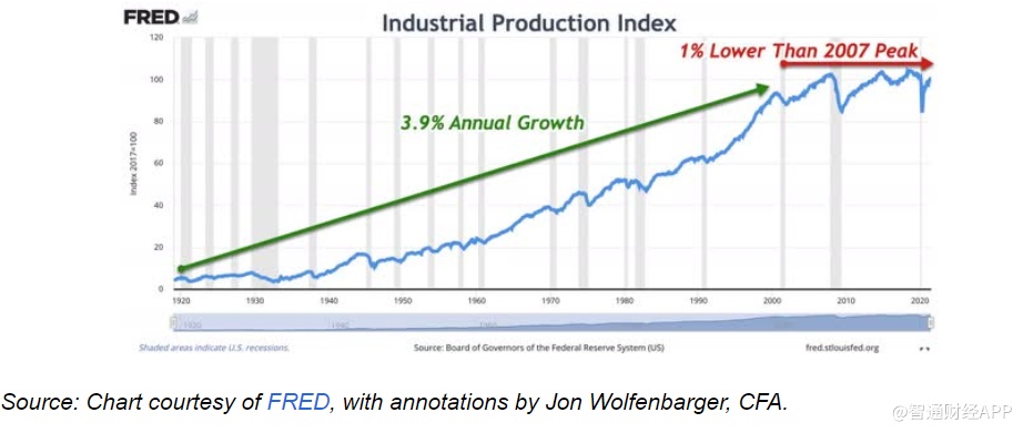 下图显示,美国工业生产指数仅比2000年的峰值高8%,比2007年的峰值低1%。在过去的20年里,它几乎停滞不前。该指标远远低于1920年到2000年3.9%的年增长率。