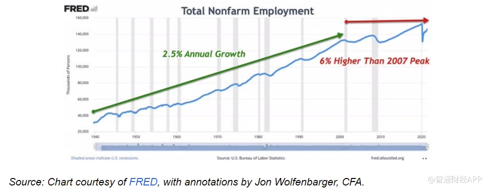从1940年到2000年,非农就业人数以2.5%的年增长率增长。与工业生产类似,就业状况在过去20年几乎停滞。与2000年的峰值相比,仅增长了10%,与2007年的峰值相比,仅增长了6%。遗憾的是, 这仍比2020年2月的峰值低近4%。
