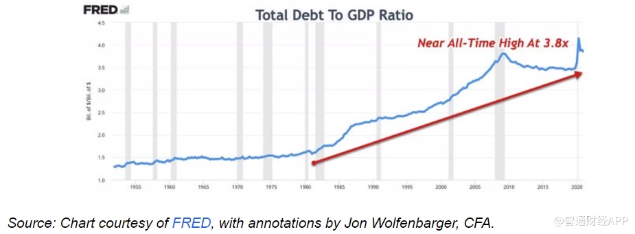 下图显示,美国总债务与GDP之比接近近期的历史高点3.8倍(或380%),甚至高于大衰退前的高水平。全球债务与GDP之比也达到了创纪录的300%,美国联邦债务与GDP之比也达到了125%。