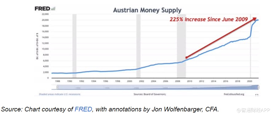 下图显示的是“奥地利货币供应量”(AMS)的变化趋势。自2020年2月以来,AMS上涨了40%,自2009年6月大衰退结束以来,更是惊人地上涨了225% !