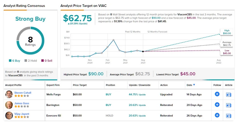 ViacomCBS在订阅用户增长、营收和盈利方面取得的成功,反映出流媒体非常受欢迎这一基本事实,再加上该公司拥有着庞大的内容库,鉴于此,富国银行分析师Steven Cahall予该股“增持”平均,目标价60美元,这意味着未来12个月将上涨约45%。