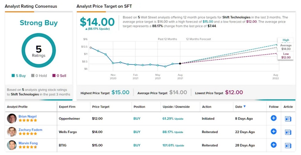 富国银行分析师Zachary Fadem认为该股股价将迎来上涨。他表示:“在二手车需求强劲、价格空前上涨、市场份额加速转移的环境下,Shift Technologies二季度的强劲业绩并不是一个意外。该公司在设定合理且可实现的期望,其内部改造和大量客户采购的超区域模式正在发挥作用。”