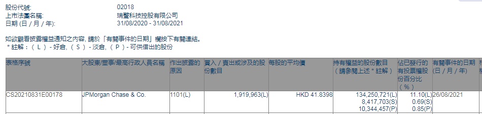 智通财经APP获悉,香港联交所最新资料显示,8月26日,小摩增持瑞声科技(02018)191.9963万股,每股作价41.8398港元,总金额约为8033.09万港元。增持后最新持股数目约为1.34亿股,最新持股比例为11.10%。