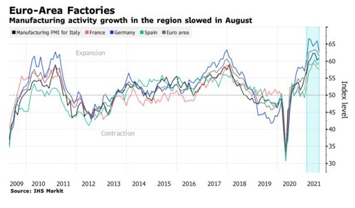 另外,有迹象表明,最初受到疫情打击严重的南欧国家正在迎头赶上。尽管IHS Markit欧元区8月制造业PMI终值由上月的62.8降至61.4,但意大利、西班牙和希腊的制造业活动指数却有所上升。