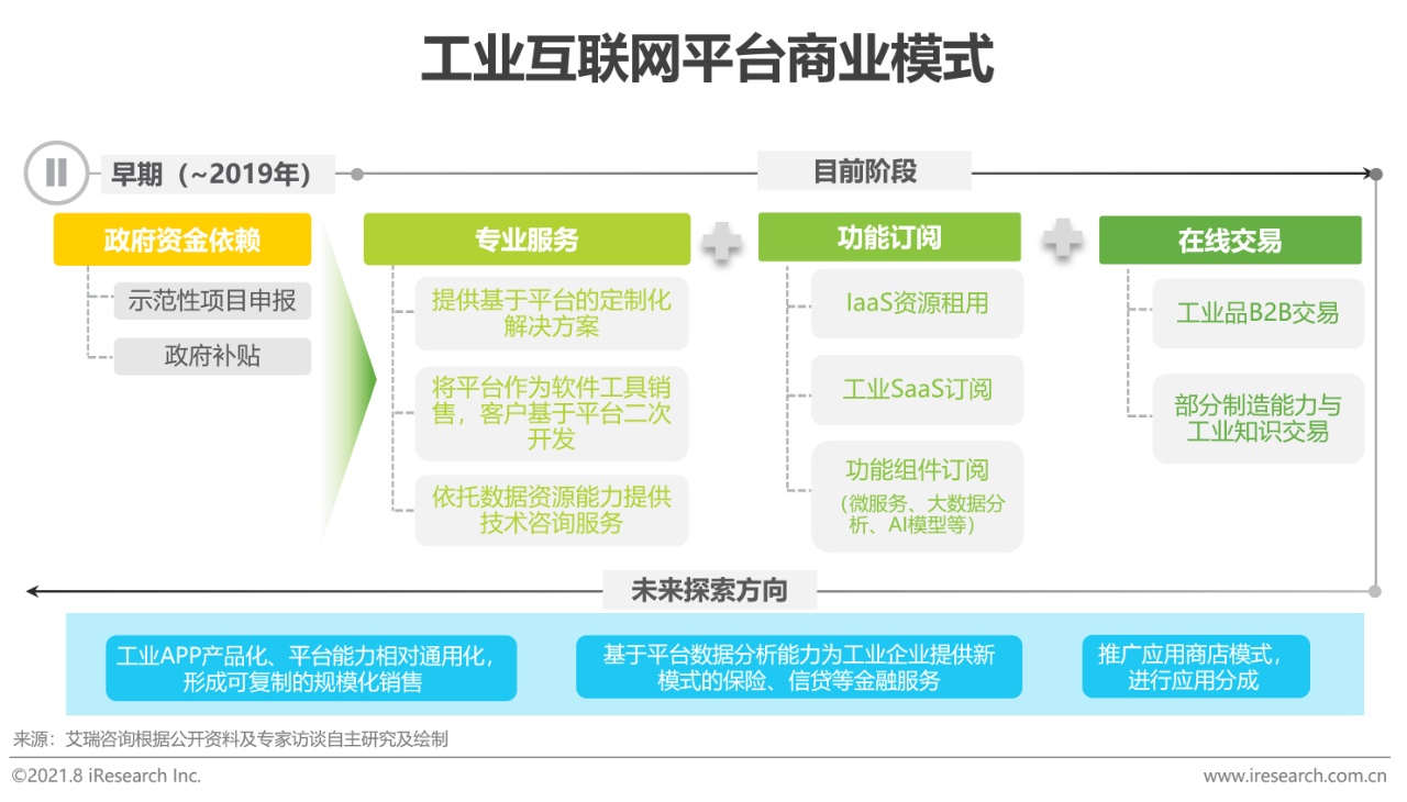 作为国家战略级的新兴朝阳产业,工业互联网在网络、安全、设备改造等基础设施部署层面的商业模式较为清晰和传统,但产业核心的平台商业模式还在不断摸索与丰富,尚未形成定局。部分消费互联网平台经济模式也出现在了工业互联网之中,但后者To B/G企业服务的色彩相当浓重,传统工业场景的多元化和复杂性也决定了工业互联网平台的商业价值主要集中于个性化服务,整体上碎片化需求与规模化供给矛盾突出,未来向通用化、可复制的标准化产品和服务延伸仍将是行业拓展商业价值关键路径之一。