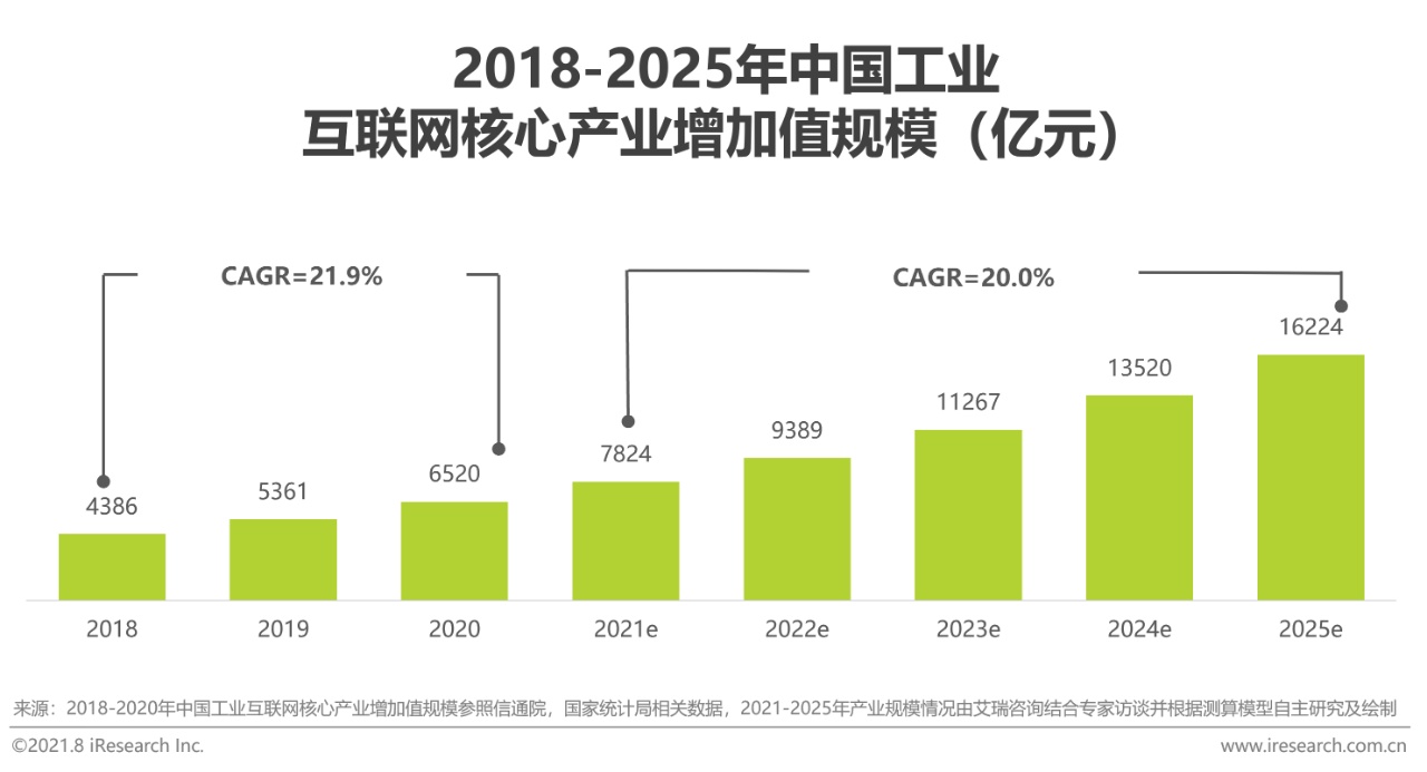 现阶段,我国工业互联网的部署与使用大多集中于数字化基础较好,对自身数字化、网络化、智能化转型定位清晰并且目标明确的大型企业。细分行业的使用率情况也较为集中,机械、能源、轻工、石化、电子信息等行业的工业互联网使用率相对较高,工业互联网对冶金、汽车、装备制造、航空航天等众多工业细分行业覆盖率则有待进一步挖掘和提升。从区域的产业发展情况来看,我国工业互联网同样呈现出东强西弱的格局,粤港澳大湾区、长三角、京津翼鲁等经济较为发达、工业基础扎实的地区是目前部署与使用的主力军。综合上述情况,艾瑞认为我国工业互联网产业经济发展潜力巨大,未来五年核心产业增加值规模预计每年将以约20%增速保持高速增长。