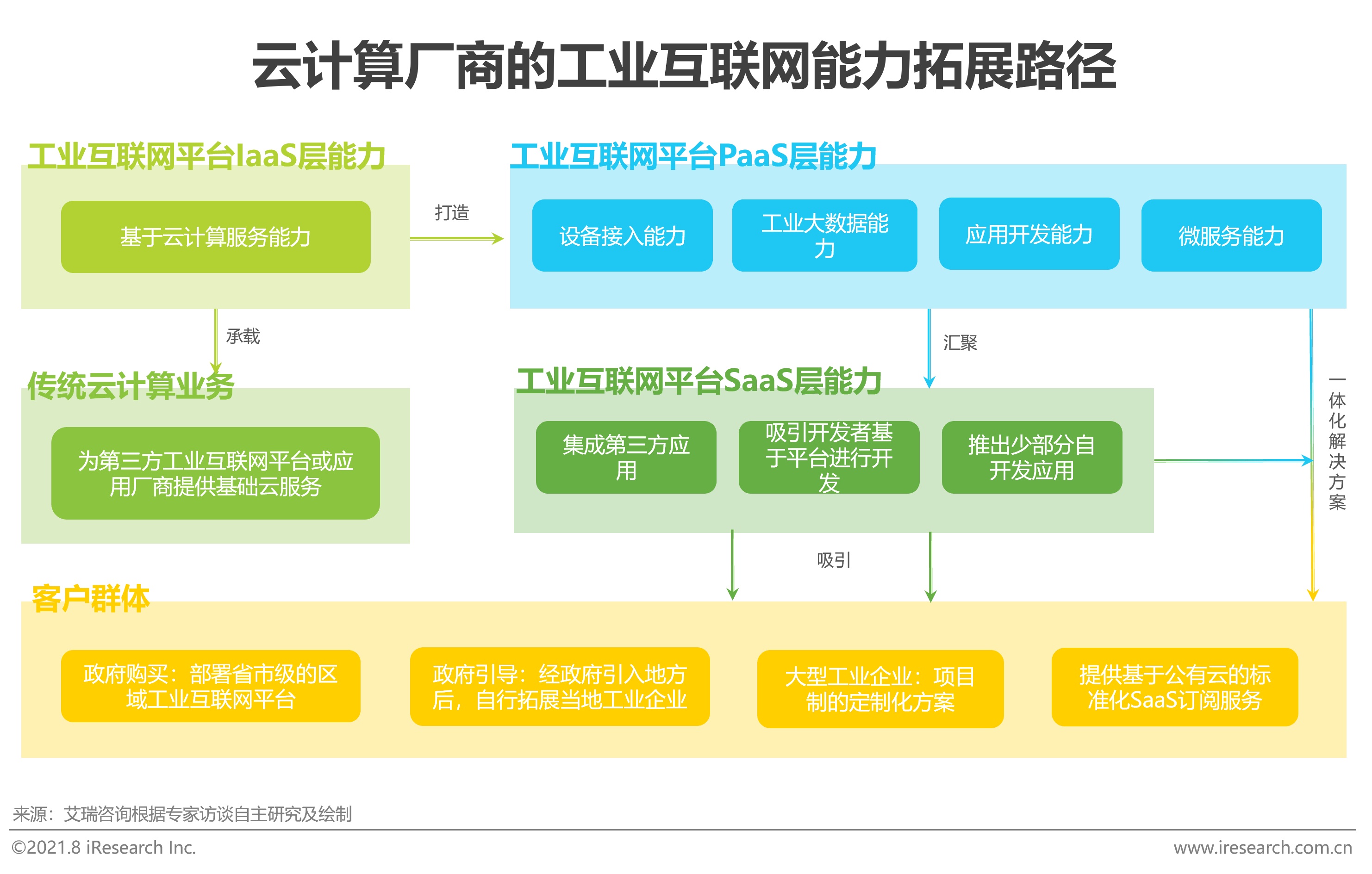 完备PaaS层能力,聚焦SaaS层丰富度。任何工业互联网平台的运行都需要云计算作为底层基础设施进行支撑,这也给云计算厂商在发展工业互联网业务时带来了一个得天独厚的优势。云计算厂商充分利用自身传统资源优势,在过硬的IaaS层能力上打造自身工业互联网平台的PaaS层,通过完善和提升PaaS层能力为与第三方应用开发厂商的合作奠定基础,并吸引更多的独立开发者基于平台能力进行应用开发,以期望能够为平台源源不断地汇聚SaaS层能力,进而形成自身成熟的工业互联网生态。