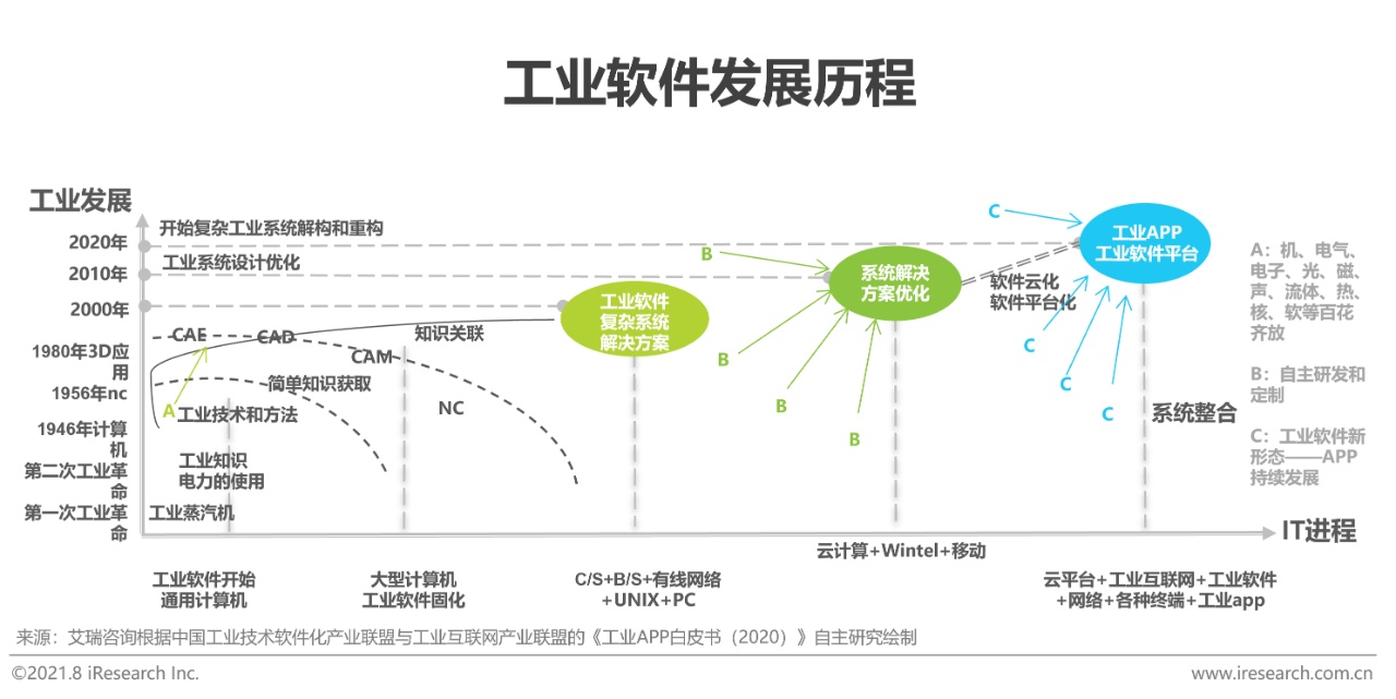 工业软件和应用是工业互联网发挥效能的最为直接和重要的抓手,工业软件的发展离不开最重要也是最核心的汇集了工业生产过程中关键技术、流程、知识、工艺及数据的工业知识数据库支持,传统工业软件厂商经过几十年的产品开发和企业服务,在工业数据与知识、开发经验以及客户资源等方面已经拥有了深厚的积累。在发展自身工业互联网业务时,软件厂商基于原有产品和知识经验的沉淀,打造平台级的SaaS产品和服务,而后将更多精力聚焦于平台与生态体系的搭建与培养,产品和服务的核心在于“平台化”属性,形成软件带动平台搭建,平台带动整体解决方案成型的发展路径。通过构建先进的平台生态业务模式,建立完善ISV 服务体系,通过“Saas+Paas+ISV 云生态”一体化运营,完成从工具型的云化软件厂商向工业互联网平台型企业的转型。面对工业互联网带来的工业软件发展契机,国内软件厂商已经瞄准工业APP这一发展工业软件的新路径,力图缩小一直以来与国际一流厂商的巨大差距,进而赢得更多的市场份额。