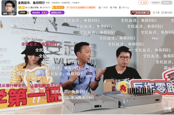 活动当天,斗鱼人气主播余小C、胡嘉一、国民大舅哥以及欢欢女神和来自武汉市公安局武昌分局、东新分局、江汉分局的警官们共同组成了“反诈天团”,在直播间里通过直播答疑、案例解析等形式为大家“带货”反电诈知识。直播过程中,斗鱼还启用了直播间“在线互动答题”功能,以此提高反电诈知识的渗透性。