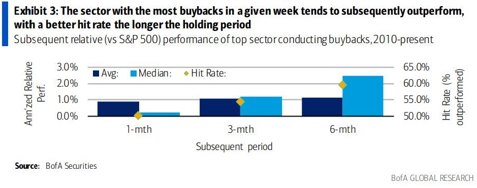 美国银行的Jill Carey Hall上周指出,“标普500指数行业在给定一周内回购最大美元金额的标普500指数板块,往往会在未来几个月表现出色,命中率超过50%。”