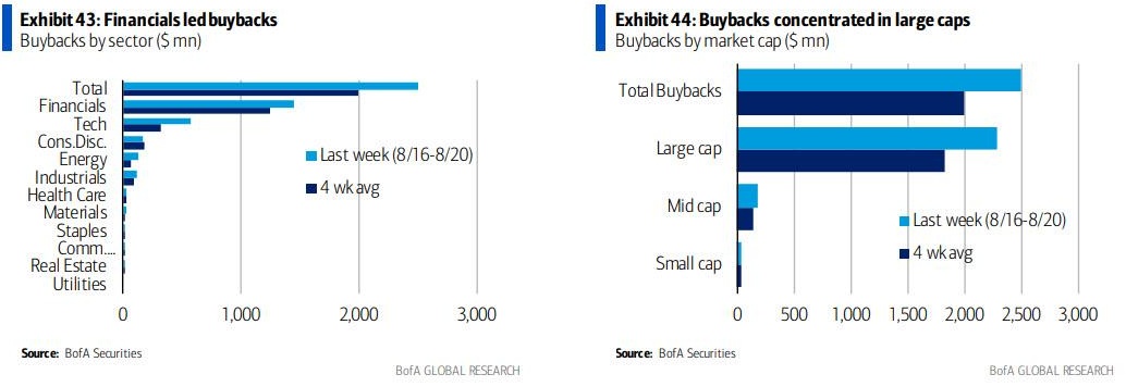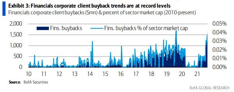 上周五的股票回购稳住了市场,美国银行补充称:“今年迄今为止,回购水平已经是自2010年以来有记录以来的第二高水平,历史最高出现在2019年,比现在高16%。”美国银行的客户流动策略师表示,尽管企业客户的回购规模较前一周略有放缓,但金融类股的回购速度加快,再创历史新高。