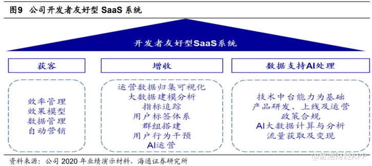 SaaS是公司另外的亮点。在SaaS业务板块,公司通过将多年来沉淀的中台技术能力,转化为互动产品全生命周期的企业级应用业务。从开发早期至产品上线及后期运营,在AI大数据计算分析等方面,为内容开发商提供全系统支持服务,为合作用户降低初期启动门槛。