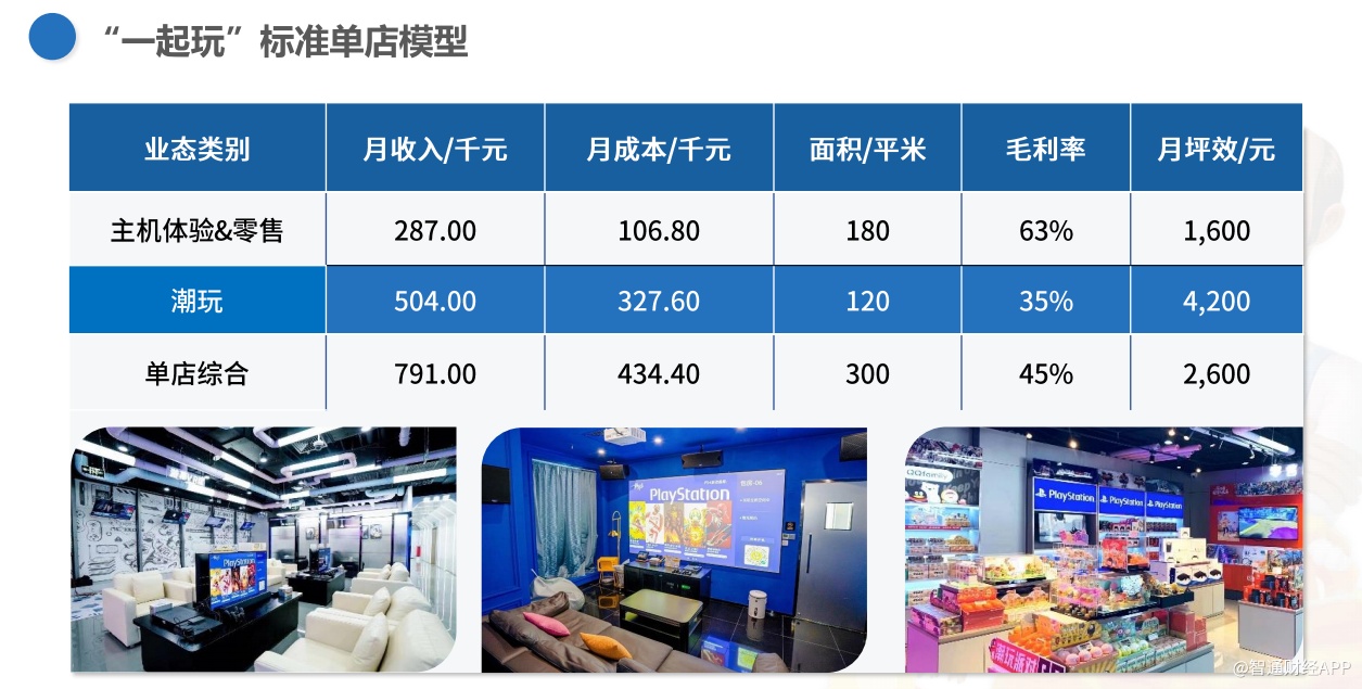 在300平米规格的“一起玩”标准店模型中,主机体验和零售业务月收入达到28万元,毛利率可达到63%,月坪效可达1600元;而在潮玩业务方面,单月收入可达近50万,坪效可以达到4000元以上,毛利水平为35%左右。