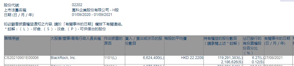 智通财经APP获悉,香港联交所最新资料显示,8月27日,贝莱德增持万科企业(02202)662.44万股,每股作价22.2208港元,总金额约为1.47亿港元。增持后最新持股数目约为1.19亿股,最新持股比例为6.27%。